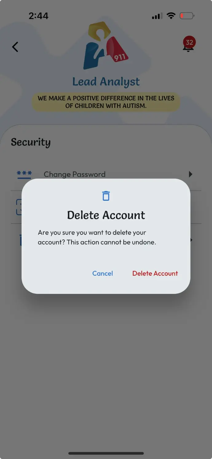 To permanently delete your account from the Autism 911 LeadAnalyst app, follow these steps: